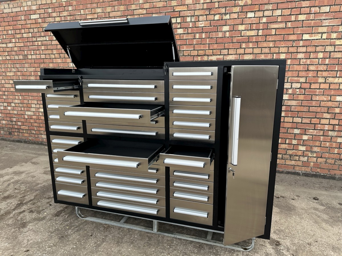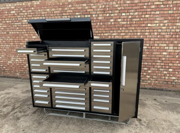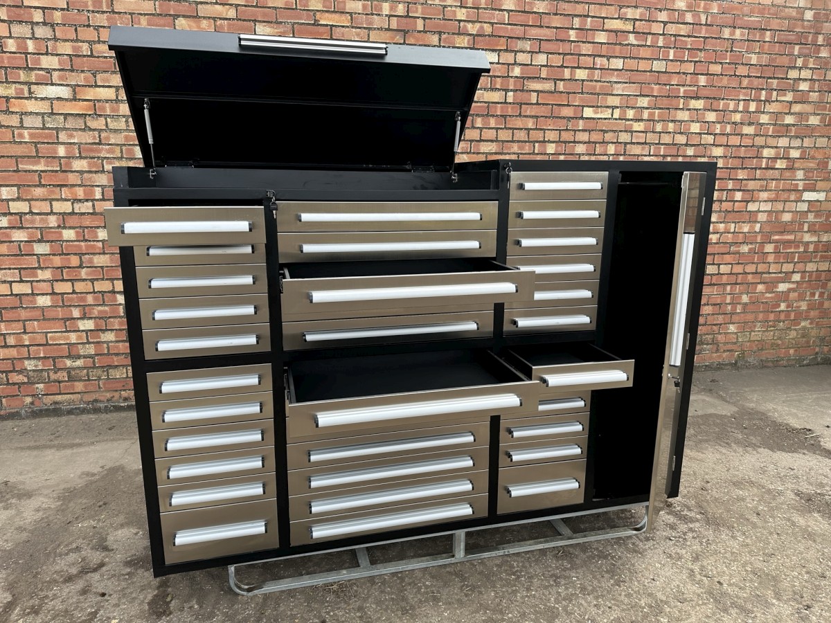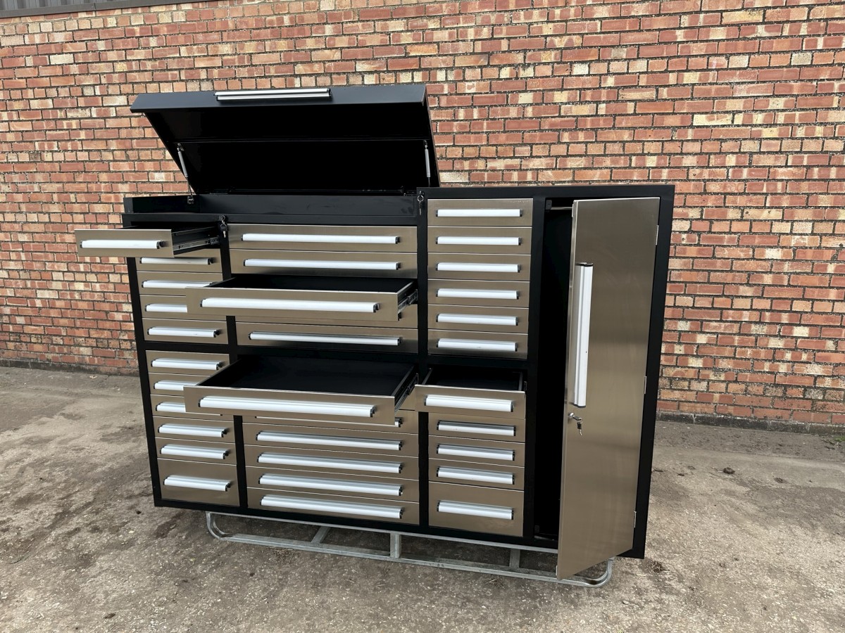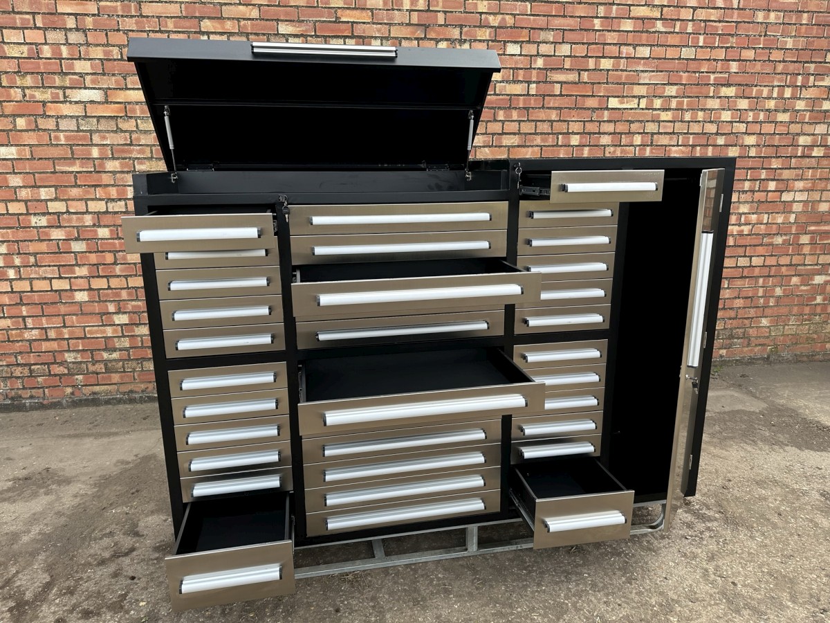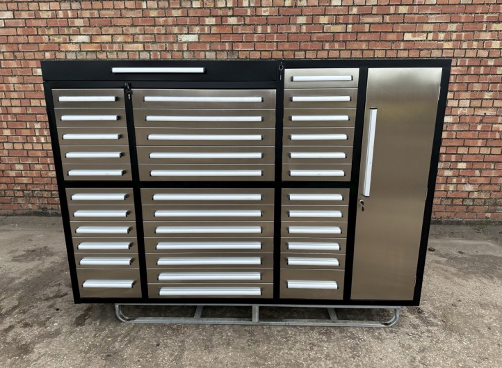 Tool Cabinet Printer-friendly versionHeavy Duty Tool Cabinet 35 draws 2 Cupboards Heavy duty draw runners Anti slip inner mat Lockable Width: 570 mm Length: 2160 mm Height: 1450 mm Price £2395 plus vat